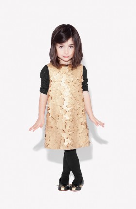 What a delightful cutout dress in gold! Also, adore the mouse shoes. Another great look with the furry, quilted vest. The new Little Marc Jacobs line for FW 2012...