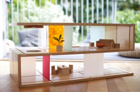 This is so cool and ingenious, I can't stand it! A contemporary coffee table in solid birch ply for the adults, and underneath a hip, modernist-inspired doll’s house with magnetic... Qubis House by Amy Whitworth